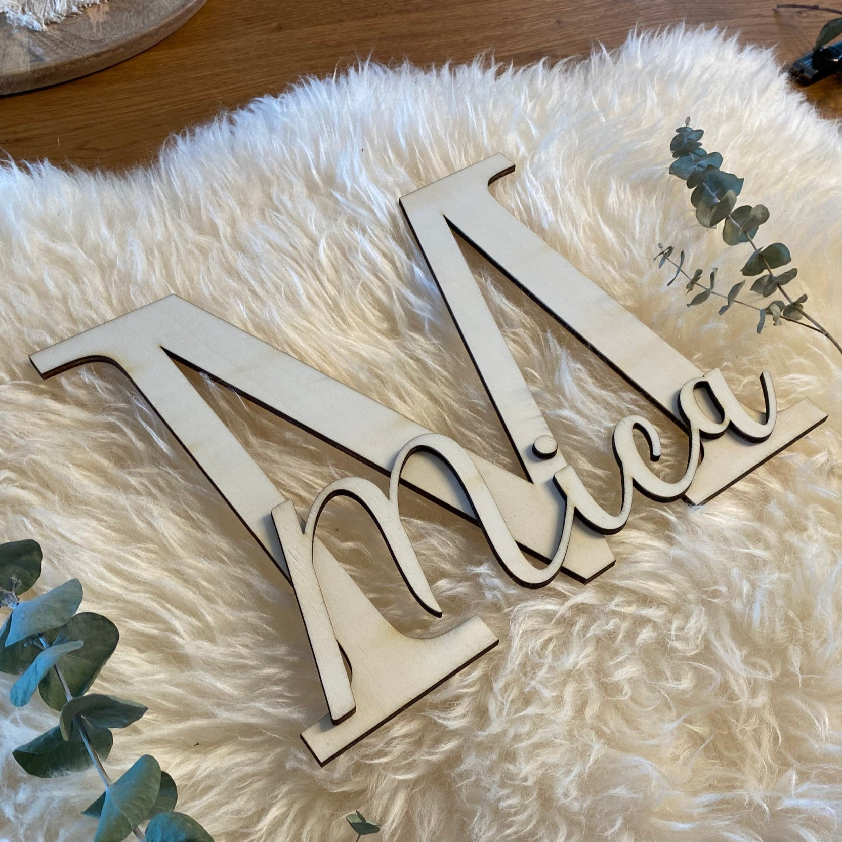 Das Holzschild besteht aus zwei Teilen – dem Motiv (4 mm stark) und dem Namen als Schriftzug im Vordergrund (4 mm stark).
