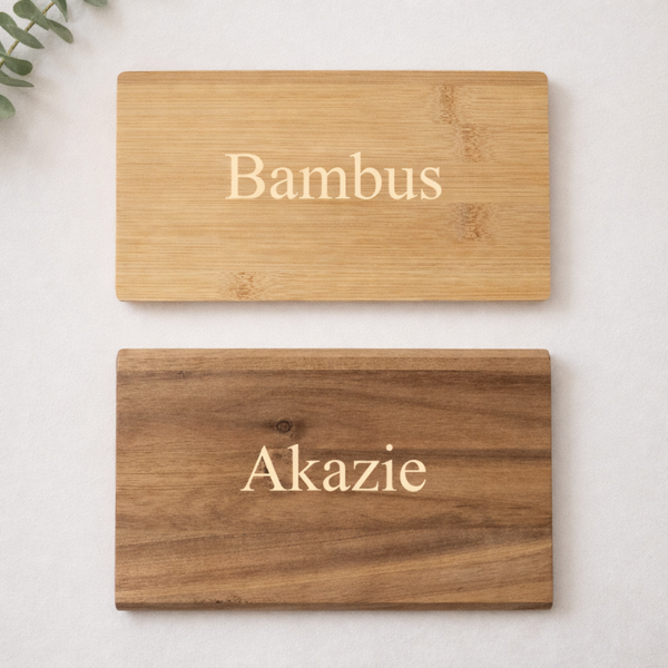 Da es sich um ein Naturprodukt handelt, können Abweichungen in Bezug auf Holzton und Gravurfarbe im Vergleich zum Bildmaterial auftreten. Solche Unterschiede stellen keinen Grund für eine Reklamation dar.