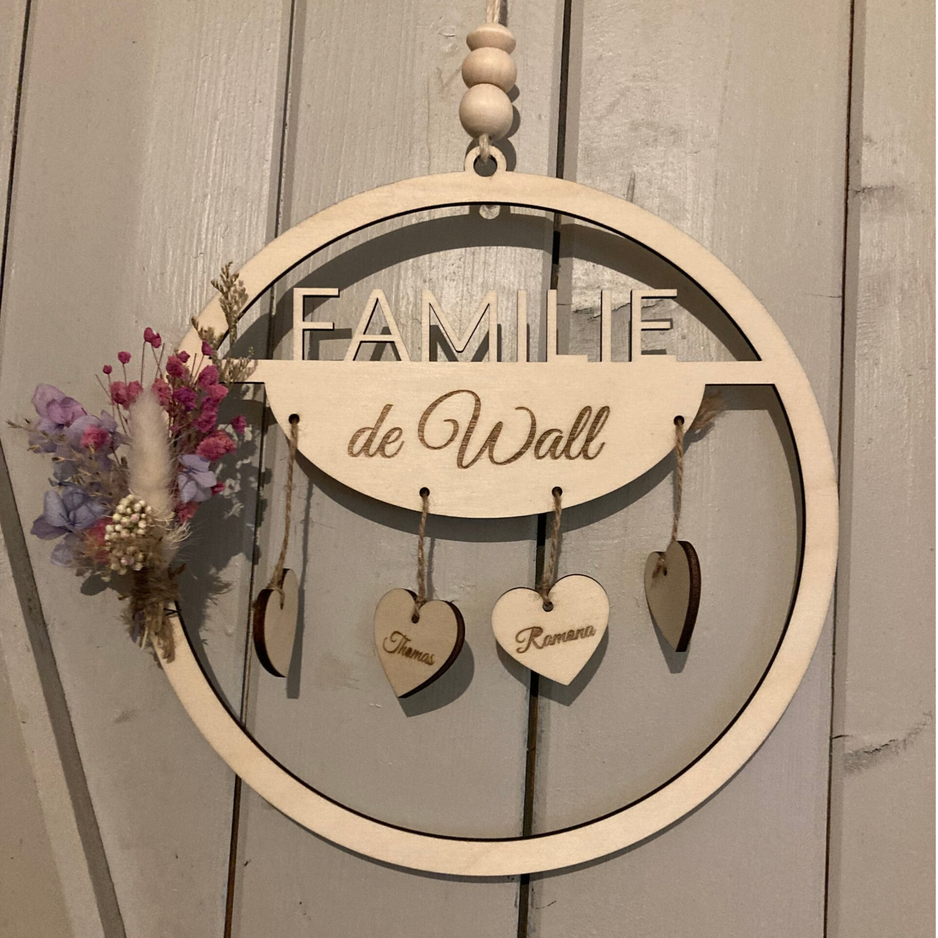 - Rundes Holzschild mit Familienname (z. B. „Familie de Wall“)
