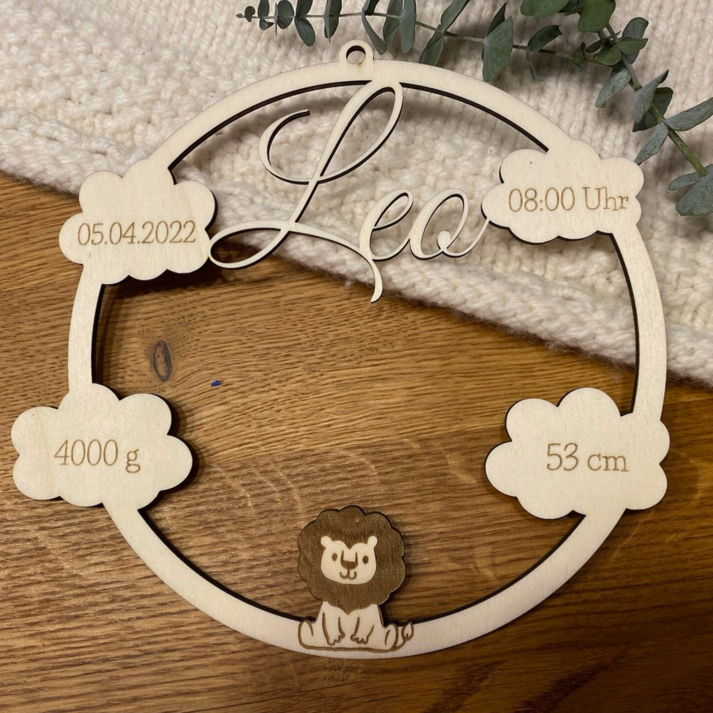 Personalisierte Wolke aus Holz – Geburtsschild mit Wunschdaten