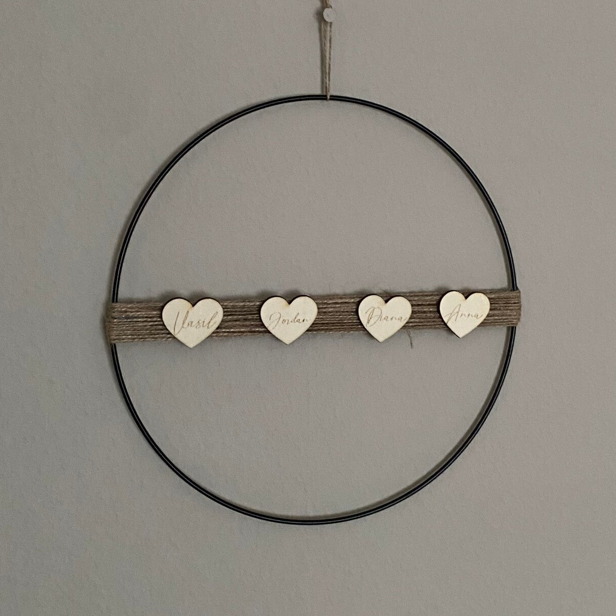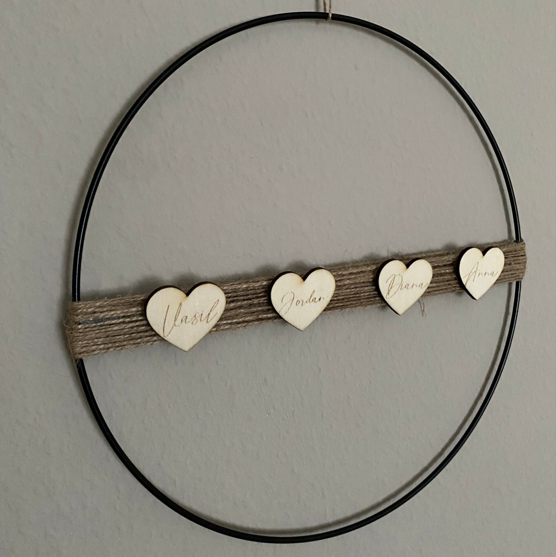 Besonders berührend: Kleine, gravierte Holzherzen tragen die Namen deiner Kinder oder Enkelkinder und machen dieses Dekostück zu einem ganz persönlichen Familienstück.