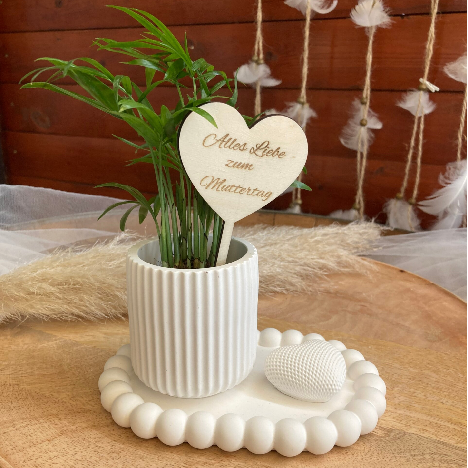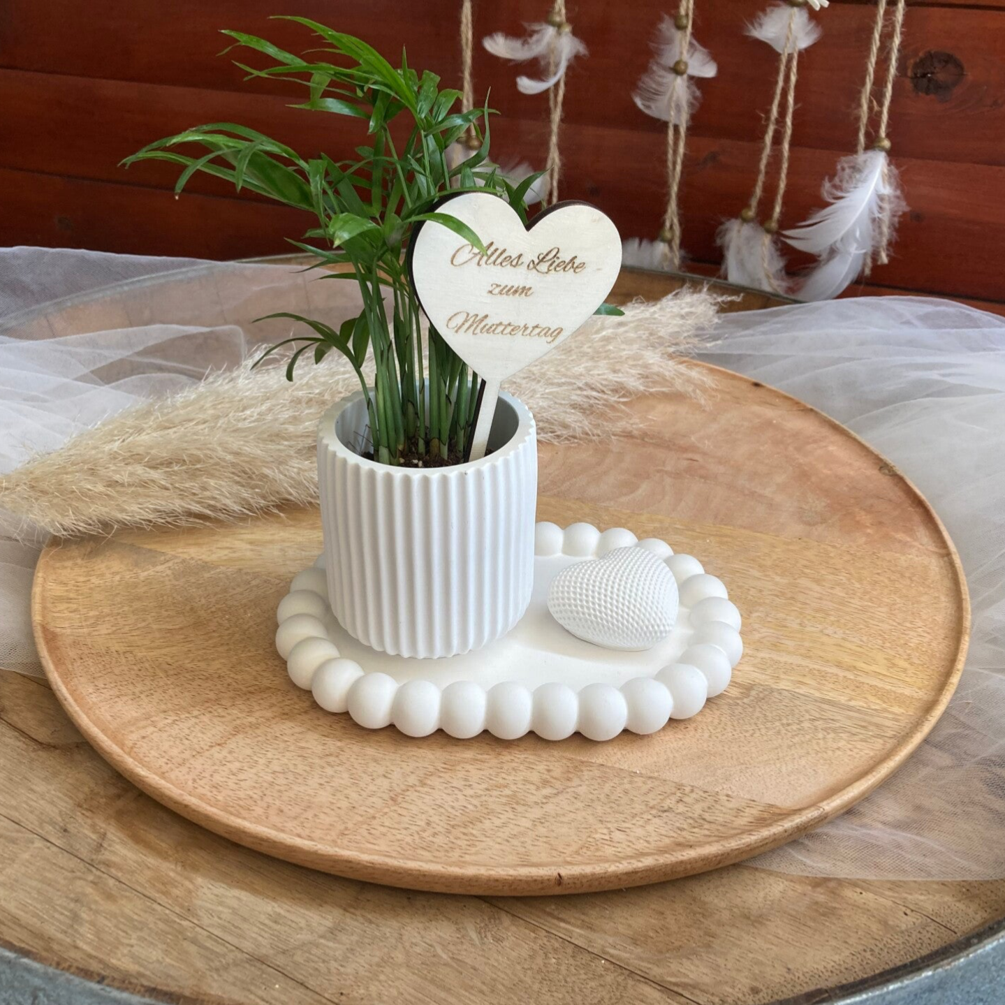 Manchmal braucht es nicht viel, um einen kleinen Wohlfühlmoment zu zaubern – wie dieses süße Deko-Set. Die hübsche Grünpflanze im gerillten Töpfchen bringt frisches Leben in dein Zuhause, und das handgefertigte Tablett mit dem kleinen Herz ist einfach zum Verlieben.