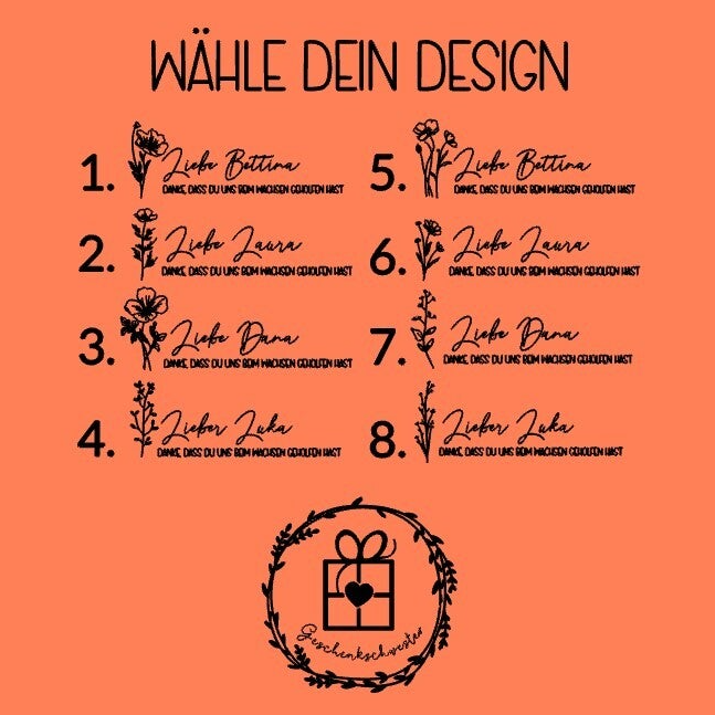 Auf der linken Seite blühen zarte Wildblumen – du hast die Wahl aus 8 wunderschönen Varianten. Daneben steht der Name der Erzieherin oder Tagesmutter in geschwungener Schrift, darunter die wertschätzenden Worte: