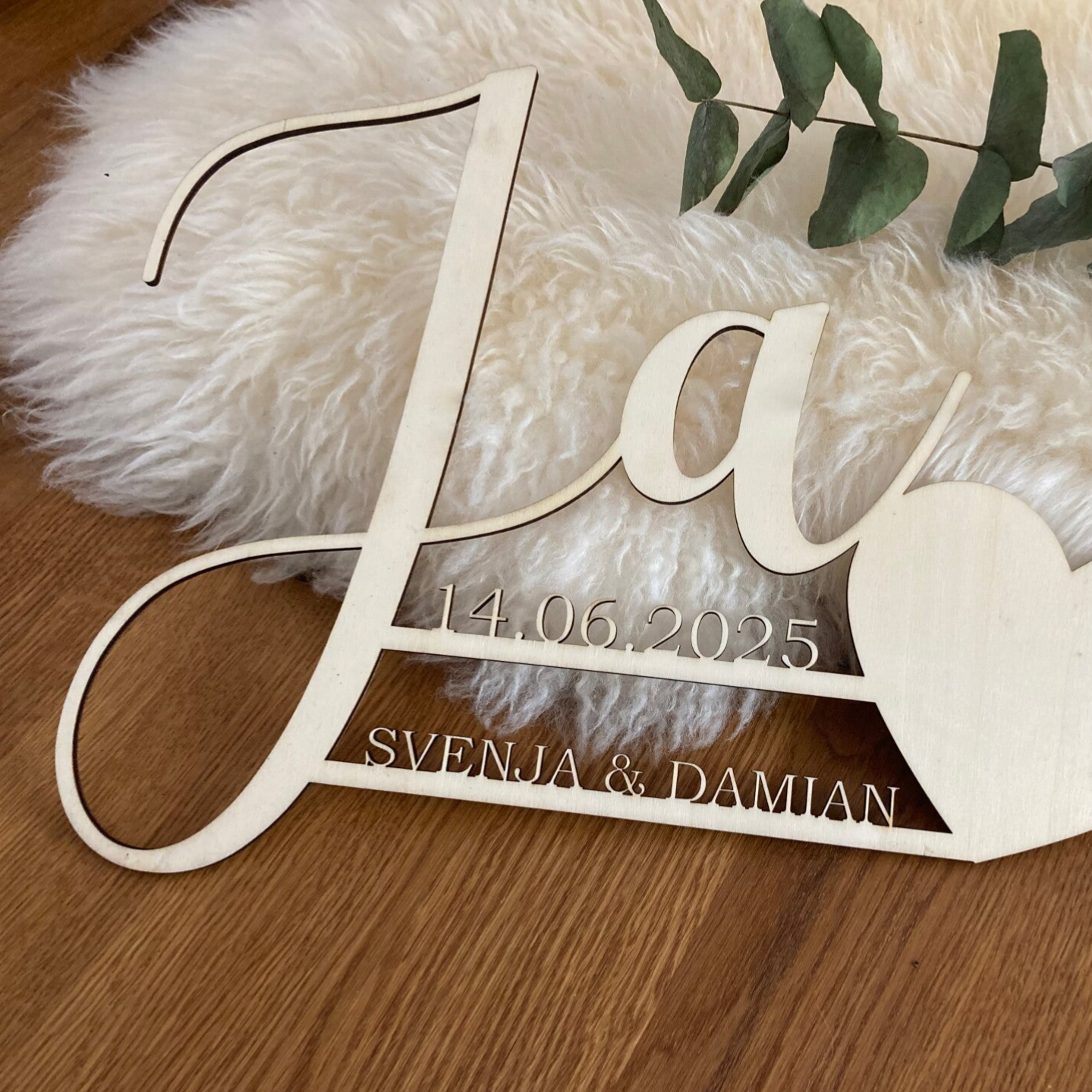 Holzschriftzug „Ja“ – personalisiert mit Namen und Hochzeitsdatum