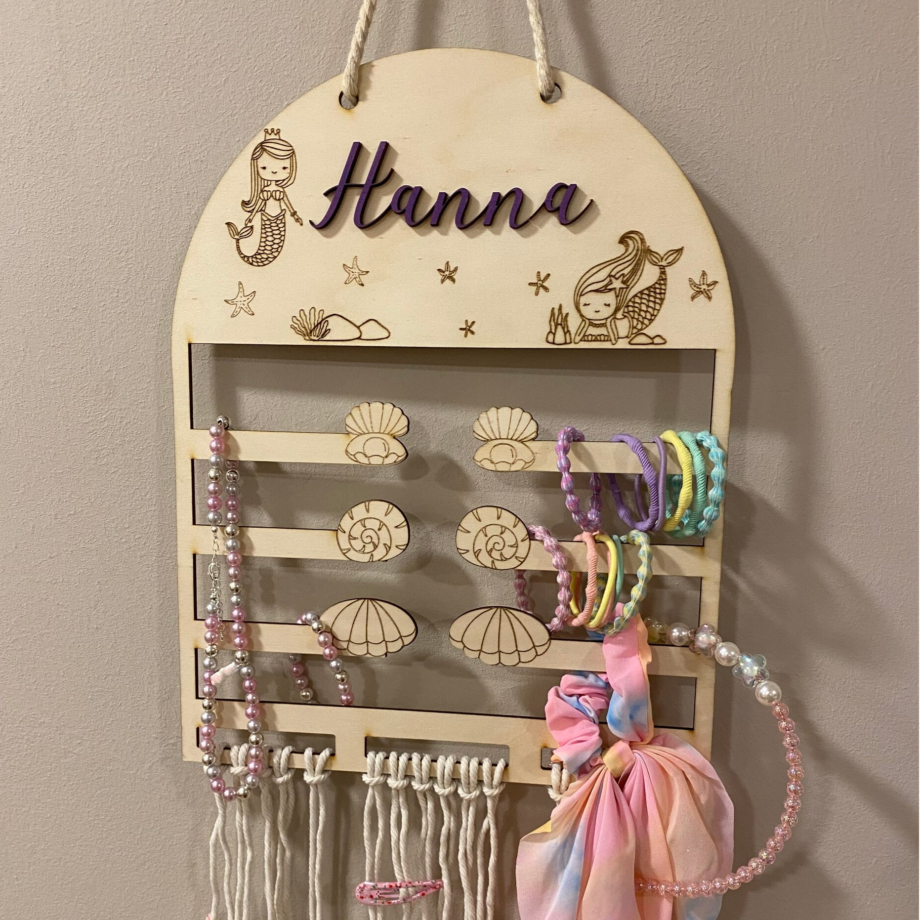 Ein zauberhafter Blickfang für kleine Meerjungfrauen! Unser personalisierter Schmuckhalter aus Holz sorgt für Ordnung bei Haarspangen, Armbändern und Ketten – und sieht dabei einfach wunderschön aus. Mit liebevoll gravierten Meerjungfrauen-Details und deinem Wunschnamen wird jedes Stück zu einem ganz besonderen Unikat.