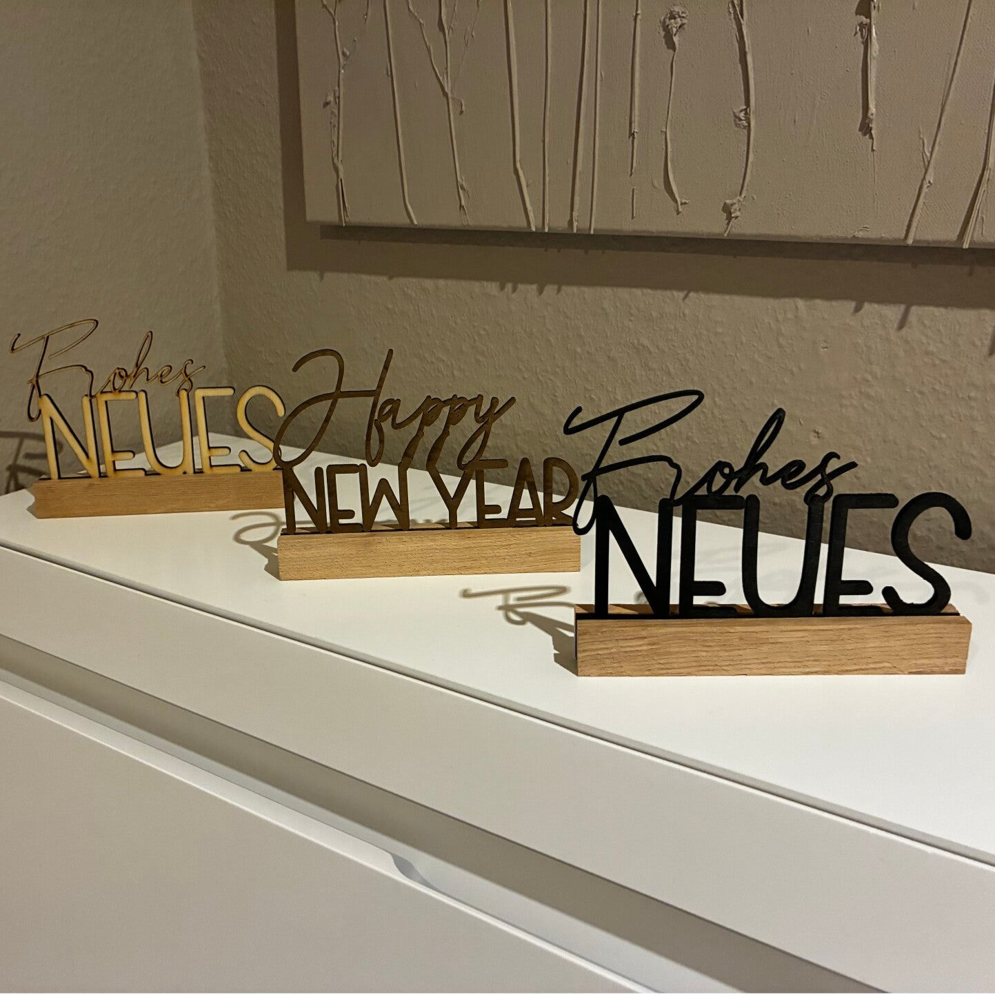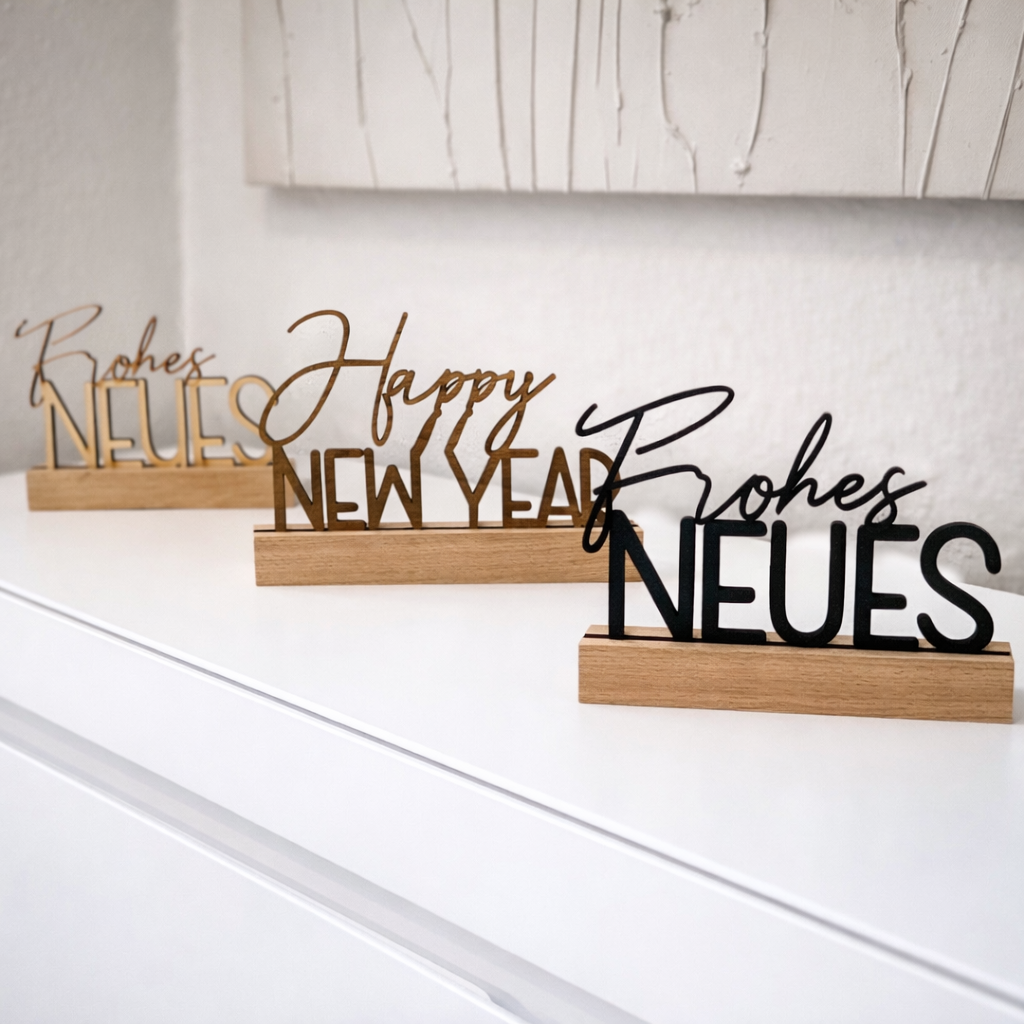 Der Schriftzug „Frohes Neues“ bzw. „Happy New Year“ steht auf einem massiven Holzsockel und fügt sich durch sein modernes Design wunderbar in jede Wohnumgebung ein – egal ob auf dem Sideboard, dem Esstisch oder im Eingangsbereich.