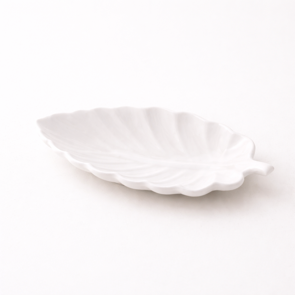 Diese elegante Blatt-Schale aus Keramik vereint dekoratives Design mit praktischer Funktion. Die feinen Blattstrukturen und die sanft geschwungene Form machen sie zu einem zeitlosen Wohnaccessoire.